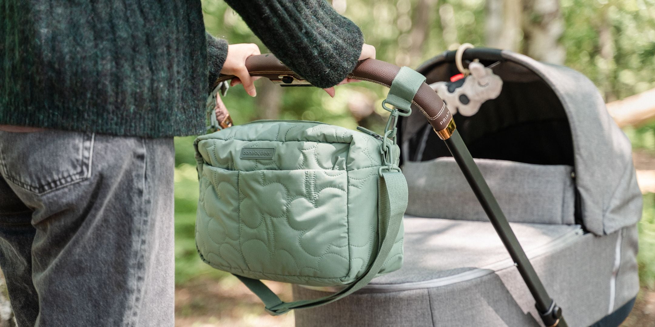 Keep the essentials close when you’re out and about. Our stroller bag in black is durable and water-repellent — a sturdy match for everyday adventures. The quilted version adds a softer touch and extra space, perfect for longer strolls or little getaways. Both attach easily to your pram with handy hooks.